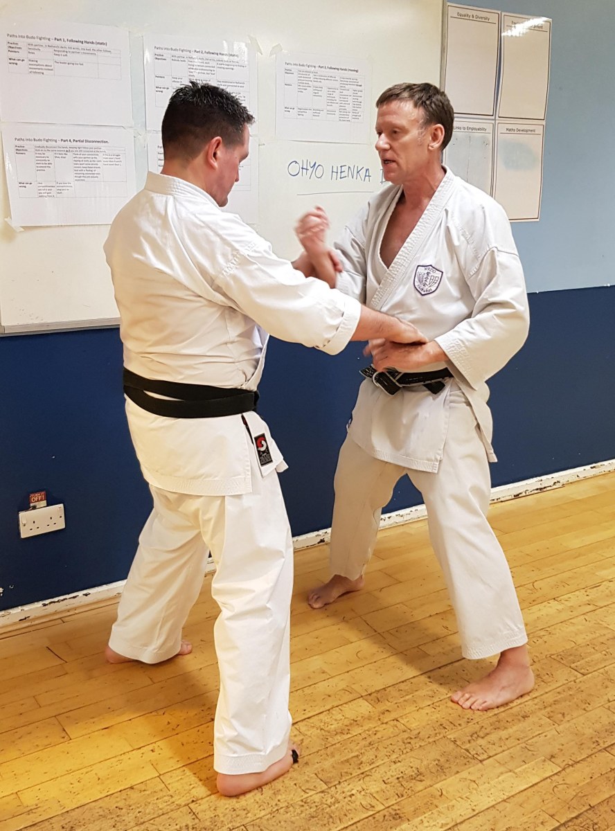 Tim Shaw explaining aspects of Ohyo Henka Dosa. With Steve Thain Sensei.