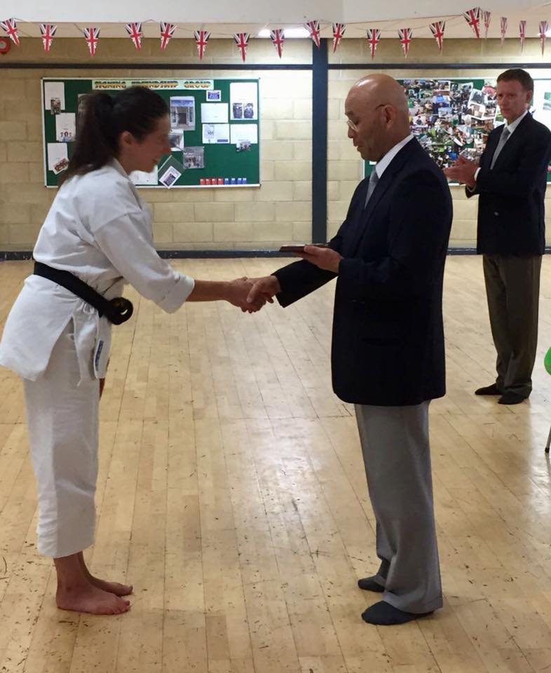 Natalie Hodgson receives her trophy for the senior kata title at the shikukai National Championships.