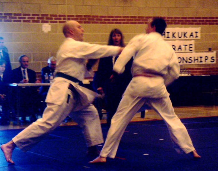 2008 – Shikukai National Championships, John Ebel (L) scores on his opponent with gyakuzuki.