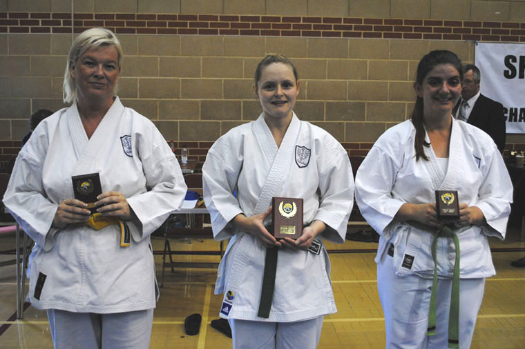 2012 – Shikukai Championships Ladies kumite, L to R, Geraldine Deasley 2nd Chelmsford, Teresa Allen 1st Chelmsford, Emma Hawkins 3rd Olympiad Chippenham.