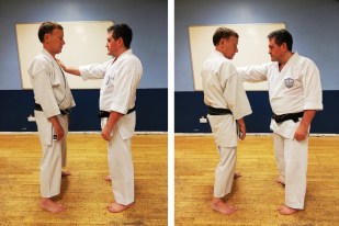But what if you decided to rotate your body the other way? If you respond to that push or punch by rotating only one way you become awfully predictable, so I describe that nagashi movement as ‘heads’ and therefore there must be a ‘tails’.